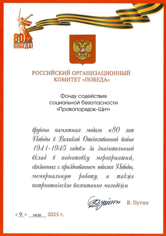 Этой высокой государственной оценки в год 80-летия Великой Победы Фонд «Правопорядок-Щит» был отмечен за многолетнюю социально полезную деятельность.