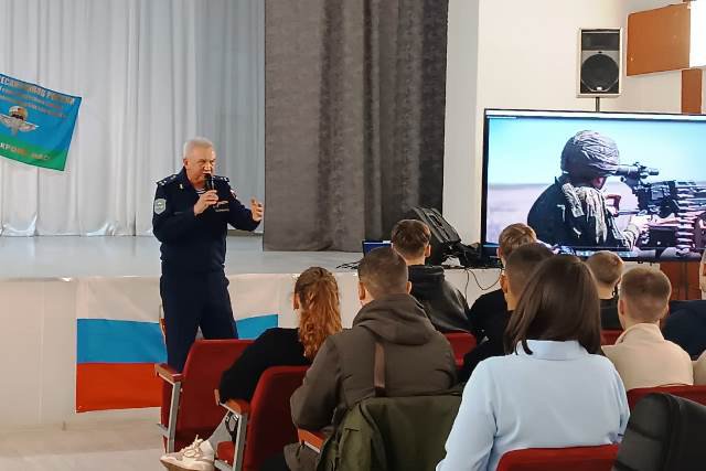 Ветеран ВДВ исполнял песни своей авторской программы ZA ПОБЕДУ в поддержку участников СВО. Рассказывал ребятам о своих поездках к бойцам, о героизме наших воинов.