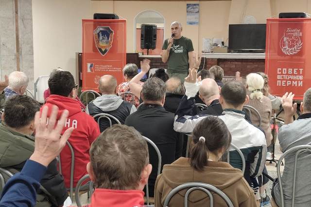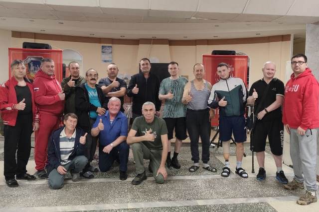 В помещении столовой собрались ветераны боевых действий в Афганистане и Чечне, действующие бойцы СВО на излечении.