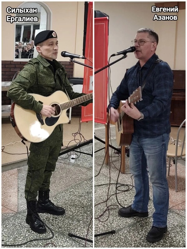 Вместе с ним на импровизированной сцене в столовой госпиталя выступили два ветерана боевых действий в Чечне - Силыхан Ергалиев и Евгений Азанов.