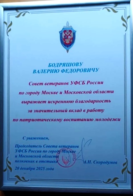 За активное участие в патриотическом воспитании молодежи В.Ф. Бодряшову было вручено благодарственное письмо Совета ветеранов Московского управления ФСБ.